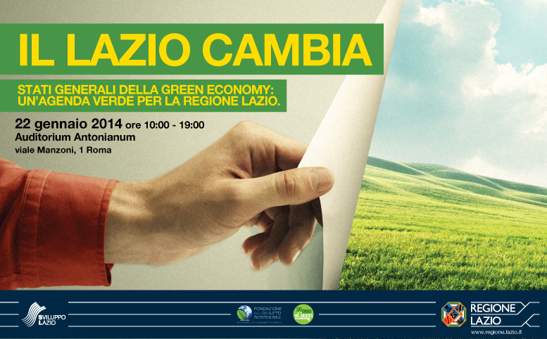 Gli Stati Generali della Green Economy vedono l'avvio del primo processo consultivo a livello regionale. La Regione Lazio, infatti, con il supporto della Fondazione per lo sviluppo sostenibile, terrà l'evento di lancio degli Stati Generali della Green Economy – Un'Agenda Verde per la Regione Lazio il prossimo 22 gennaio 2014 dalle 10.00 alle 19.00 presso l'Auditorium Antonianum di Roma in Viale Manzoni 1.